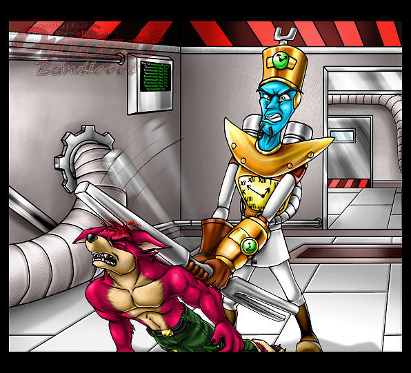 Crunch stood there staring viciously at the blue skinned man. Tropy looked back, almost as angry as the bandicoot. He charged forward to swipe at him, but Crunch dodged him again and attempted to trip him over, Tropy almost fell but caught his balance as he got back up again to try striking at Crunch, Crunch tried to punch but also missed at the same time. The angry anthro then quickly ran to try another hit at the man but this time, jumped to try and bite at Tropy's face! He gasped and quickly moved, avoiding the small, but still deadly bite from the animal. Nefarious then tried to throw his turning fork but it only just touched Crunch's fur but then it was too late for him to move and Crunch done the same technique again! This time, almost piecing through Tropy's face or neck but only one of his canines slashed him across the cheek, Tropy got a shock and quickly turned but this also caused Crunch to get a slash to his arm from Tropy's shoulder armour and he feel to the ground. Crunch clutched onto his arm, and saw that it was bleeding slightly bad, but not too much, but this only caused him to lose focus of the fight and Nefarious came up behind him and gave him a nasty surprise...