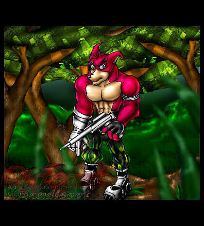 But then suddenly, a figure was seen within the jungles of the island… Burgundy fur dashed past trees and ferns and a flash of steel shined in a blink of an eye, he leaped over a few bushes and landed on the ground with a thud and quickly ducked down to avoid being noticed with his very noticeable colours… yeah kids, you guessed it…he was Crunch.