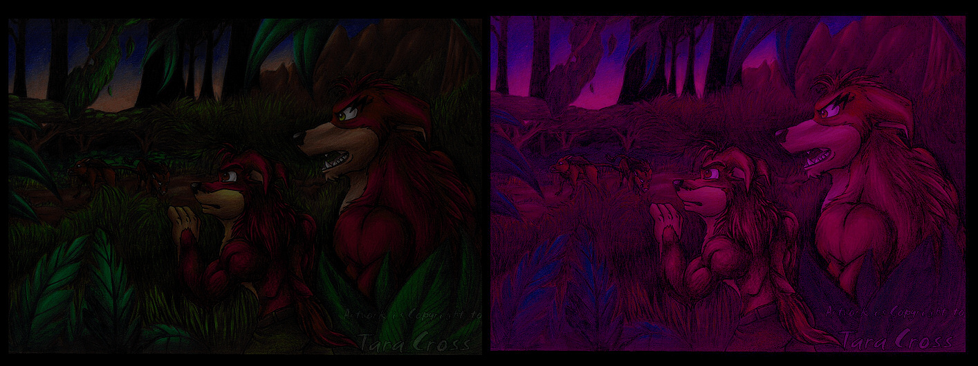 The anthro from is similar to the Half Evolved, but with big changes. They instead, breed around Autumn. Takes about 4 to 5 months for the pup/joey to be born. Unlike the other forms, the females don't have a pouch (because they're able to stand upright, meaning a backwards pouch wouldn't be of good use) and the young are born with very short fur. Still very undeveloped, as they can't see or hear yet, but can touch and smell, and are still very small in comparison to the parents. Both parents, care for the young and both share an equally close bond with their young and will do anything to protect them. They usually have 2, but first time mothers usually have 1, and on rare occasions, some will have 3 or 4. Some will even breed again if they only end up with 1 offspring at first... they will rarely do so if they already have 2 or more though. The pups can hear after 2 weeks and open their eyes after about 3 to 4 weeks. Their eye colour will always be dark green or dark blue at first, and may change as they grow older. As soon as their teeth appear, they're able to eat food... at around 4 months old. They start to leave their home and go on adventures with their parents when they're around 7 months old, depending on how safe their homeland is. They'll have years of joy and fun with their family until they get into the more serious side of their lives. They won't ever start to learn hunting and surviving in the wild until around the age of 6 years, and don't leave their parents until at least 9 years old for males, and 10 for females (as some daughters sometimes stay behind to learn how to raise their own offspring one day, since usually once the parents haven't got any young left to raise, they'll have another litter soon after). Because of the long years of raising their offspring, they can often only have as few as 2 or 3 litters in their whole lifetime, around 3 to 8 young (Much less than the other forms). Also, once they're adults, they will also visit their parents occasionally, and it doesn't often end up in fights or arguments. Due to their close bonds, but they do like to have their own space, which is why they will get their own land/territory, away (but not usually too far) from home.